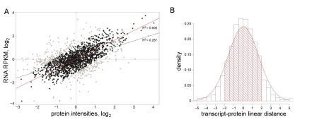 Transcripts and proteins that are systematically discordant across multiple cell lines could either be a definition of a normal state of the cell or an artifact of data acquisition. The proteome represents a snapshot of the system, which partially consists of proteins that do not require frequent renewal, such as structural or membrane proteins. Because their synthesis happens at the early stage of cell life, these proteins might not be accurately represented by RNA-seq data. We tested that hypothesis for the subcellular localization (Supplementary Figure 4), and no specificity toward lower (in the case when these proteins are lost due to imperfect sample preparation in the proteomics experiment) or higher (when RNA-seq data is inaccurate) distances was detected. In fact, distribution of distances for a subset of genes/proteins almost perfectly mimicked the overall distribution for all genes/proteins, with the maximum frequency around zero and gradually decreasing towards the positive and negative ends.