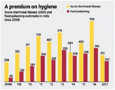 Cross contamination occurs during the handling of raw meat, especially poultry meat, because of the presence of more liquid in raw meat than cooked meat.4,5 Contamination is a common process seen all over the world on carcasses in abattoirs.6,7 Drug resistant bacteria can and do travel on meat.8 They can also lead to longer illness and more hospitalizations with longer stays. Multi drug resistant infections are on the rise while the development of new antibiotics is coming to a standstill. Various meat samples have been taken from supermarkets in 2011, detailed analysis were performed by U.S Department of agriculture, centers for disease control and prevention, and federal food and drug administration. It was observed that significant amounts of superbug versions of campylobacter and salmonella9 were found which leads to 3.6 million food poisoning cases annually.10–13 Recent data put out by the Union Health Ministry’s Integrated Disease Surveillance Programme (IDSP) has recently made their data public, which indicates that food poisoning is one of the most common outbreaks of India reported in 2017 (Figure 1).
