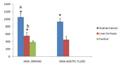 Figure 1 Significance of serum and ascitic fluid concentrations of Malondialdehyde (MDA) in ovarian cancer, liver cirrhosis and control group. a* indicates p<0.001 ovarian cancer vs liver cirrhosis & control; b* p<0.001 liver cirrhosis vs control; *p<0.001 indicates ascitic fluid from ovarian cancer vs liver cirrhosis.