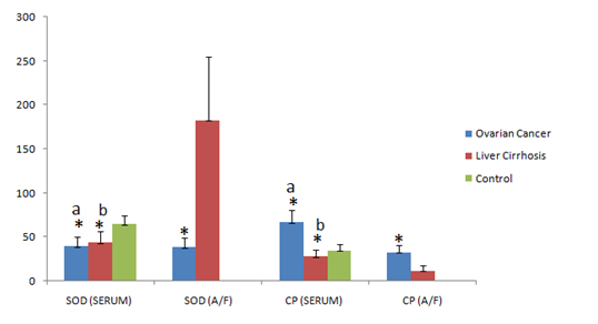 Figure 2 Significance of serum and ascitic fluid concentrations Superoxide dismutase (SOD) and Ceruloplasmin (CP) in ovarian cancer, liver cirrhosis and control group, (mean±SD); a* indicates p<0.001 ovarian cancer vs liver cirrhosis & control; b* p<0.001 liver cirrhosis vs control; * p<0.001 indicates ascitic fluid ovarian cancer vs liver cirrhosis.