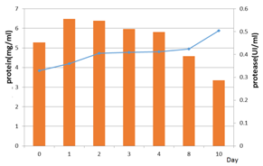 The autolysis process increased protein product value due to the intrinsic system of earthworm protease. In our initial study, we examined autolysis process in natural conditions and record edautolysis results over time under the effect of protease earthworm system, and the results given as follows: Protease activity increased through autolysis time, according to Phan Thi Bich Tram, the highest separate activity in 10days,5 but the results showed that protein content decreased. So earthworm protease activity in optimal conditions did not collect protein-rich liquid. While fresh earthworms after 10days of autolysis had high protease activity, but smelled because of strong autolysis producing undesirable products, so we will continue to find conditions to obtain useful protein products (Figure 1).