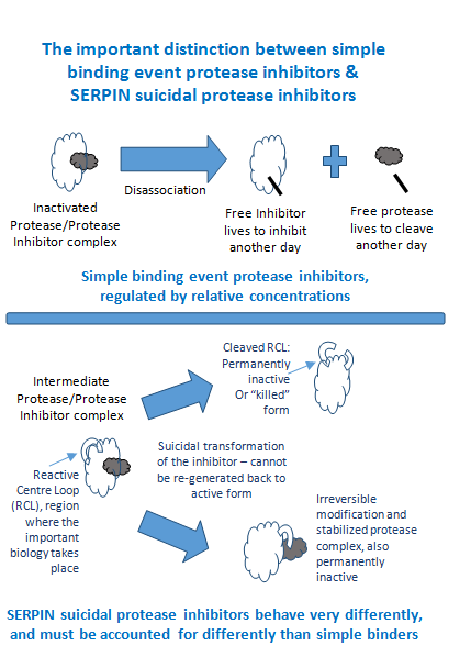 One possible outcome is driven by covalent modification permanently inactivating the inhibitory capacity as the SERPIN peptide reactive bond region is irreversibly bound to the protease, and thus cannot be reconstituted back to an active form. The second possible outcome is a permanently inactive or “killed” Proteoform of the SERPIN as the peptide RCL region is cleaved and can no longer bind target substrates.4