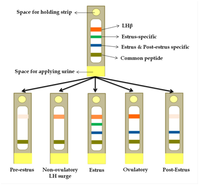 Excretory fluids like urine reflect the internal status of the animal and have been proposed to be a better medium for assessing the reproductive status, non-invasively. Timed-artificial insemination by assessing urine for peptide hormones is in practice for many mammals. Luteinizing hormone (LH) is a heterodimeric glycoprotein, has an important role in ovulation, and its presence in urine is detected by its metabolite LHβ-core fragment (LHβcf). The pattern of LH surge in buffalo urine was analysed and found that the extended LH surge window increases the success rate of prediction of ovulation period in this species.4 In addition, an increased rate of conception was observed when inseminated artificially after positive-prediction of ovulation period through a cut-off LH value.5 Though, efficacy of LH peptide based prediction method was evidenced, sensitivity of this method was limited by occurrence of multiple LH waves with different amplitudes, before and after the core pre-ovulatory LH surge.4