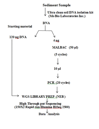 DNA was extracted from 50mg sediment using Ultra clean Soil DNA Isolation Kit (MO-BIO, USA) following the manufacturer's recommendations. The quality and quantity of the extracted DNA was checked using agarose gel (1%) stained with sybr safe and Qubit dsDNA HS assay kit (Invitrogen, USA) respectively followed by the MALBAC procedure.