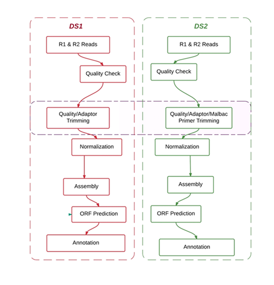 Table 1 Assembly summary for Illumina data of DS1 and DS2 samples. It represents raw reads obtained, normalized read count, average read length obtained in bp, total number of contigs obtained from data, N50 and longest contig representation of DS1 and DS2 sample