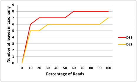 The contig size length distribution differs for DS1 and DS2 (Figure 4) (Figure 5). MALBAC based sample has less contig length than the direct methodology, even though the longest contig was obtained in DS2. Microbial ecology has many tools for assessing species diversity. Rarefaction curves are used to estimate the coverage obtained from sampling (Figure 6). No significant difference observed between the number of leaves in taxonomy of DS1 and DS2.