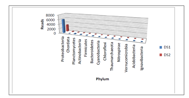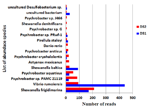 The microbial community of the sediment was dominated by Proteobacteria, followed by Planctomycetes, Actinobacteria, Firmicutes, Bacteroidetes, Cyanobacteria, Chloroflexi, Nitrospirae, Acidobacteria etc. The major representatives are found to be similar in both of the samples with slightly varied abundance (Figure 7) Microbial diversity in both of the methodology shows the presence of Shewanella frigidimarina Antartic bacterial species which has the ability to produce Omega 3 fatty acid like Eicosapentaenoic acid which has medicinal properties. Other major representative in both methodologies is Vibrio rumoiensis, psychrophilic bacteria, which has high catalase activity.