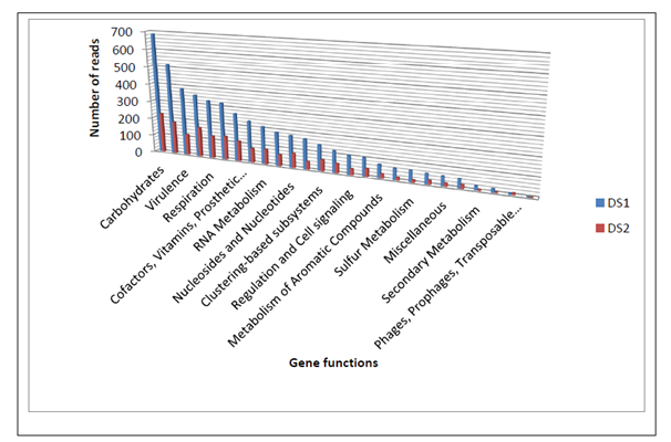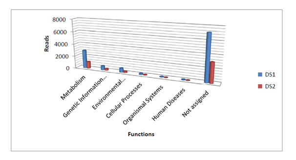 The raw reads of samples (DS1 and DS2) were quality checked using FastQC tool15 and the reads with Phred quality ≥Q20 were retained for further downstream analysis. The adapters were removed from the sample reads using cutadapt, version 1.8.16 MALBAC primers were removed from raw reads of DS2 using an in-house perl program. Prior to assembly, all reads were normalized to the lowest read count (1.92million reads) among the two samples (DS1 & DS2), in order to avoid any assembly bias. Pre-processed sequences were the assembled with RayMeta17 using a k-mer size of 31. The contigs with less than 150bp length were filtered and protein coding regions (Figure 3) were predicted using Glimmer-MG v0.3.218 program. We performed BLASTX of all the predicted genes against the protein database using the BLAST version 2.2.29+19 with an e value of 1e-5. The functional analysis of all hits were analysed using the KEGG20 and SEED21 options provided in the MEGAN software.22