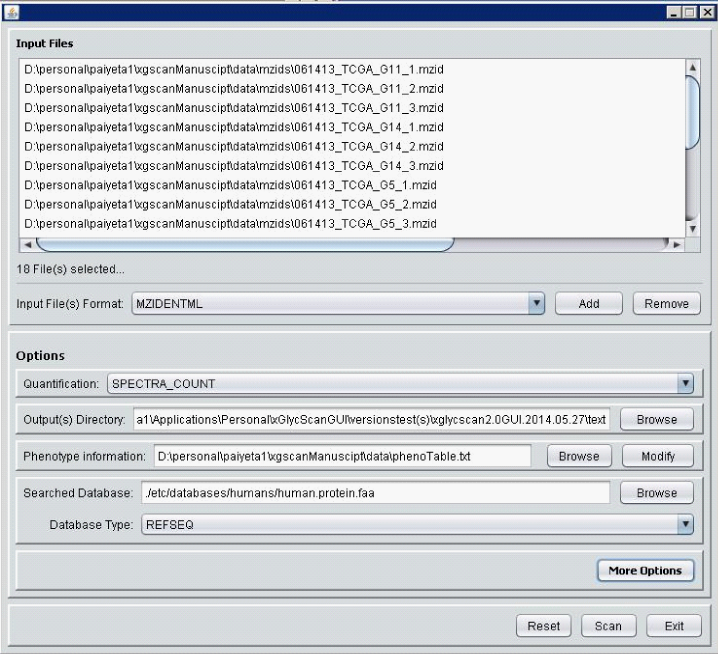 We implemented XGlycScan entirely in the Java programming language to ensure a wide range of operating system platform compatibility. Also to ensure compatibility with a wide range of search engine outputs, XGlycScan, by default, receives the proteomics community (PSI, Proteomics Standard Initiative) defined mzIdentML data format46,49 files as input Table 1. XGlycScan utilizes the jmzIdentML Java API50 in reading and accessing defined objects in input file (s). Result outputs are written to a tables' directory in user-specified output location. See documentation in the README file or at https://bitbucket.org/paiyetan/xglycscan/wiki/Home for details