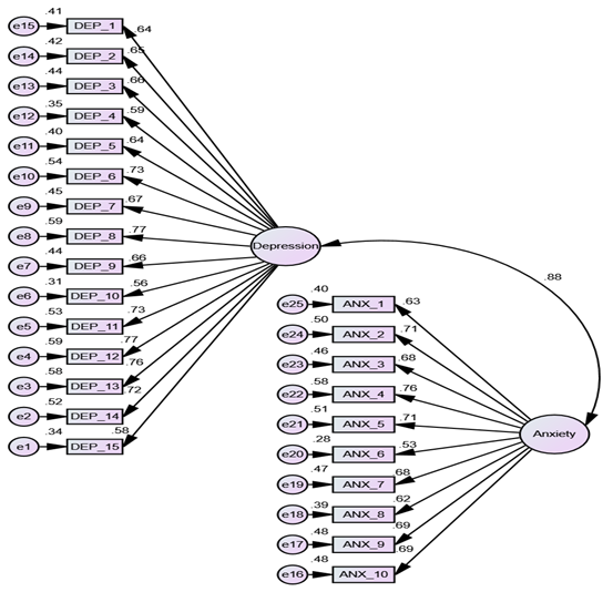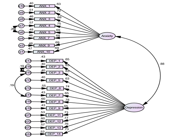 Reliability: A summary of each construct and item with its factor loading, reliability coefficient (Cronbach alpha), CR, and AVE is presented below (Table 3). To achieve construct reliability, the values of CR and AVE should be greater than 0.6 and 0.5 respectively. The AVE scores for anxiety and depression measures were 0.479 and 0.488 respectively.