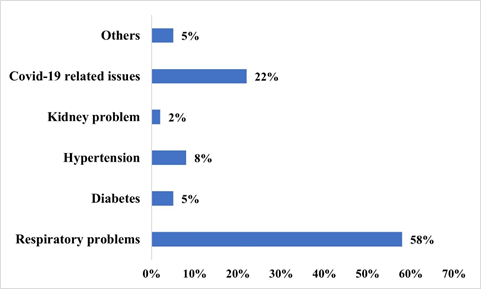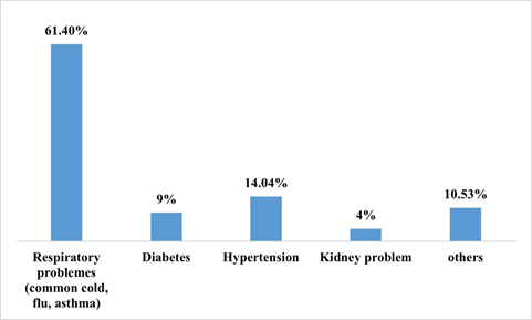 Among 207 general people, 24.64% (n=51) took health service through telemedicine before pandemic and 50.23% during pandemic. But 75.36% (n=156) said that they didn't take any health service. Among all the respondents, 61.40% (n=35) said that they took health services for respiratory problems before the pandemic via telemedicine. 14.04% (n=8) also said that they took telemedicine service for hypertension. Before the pandemic, telemedicine was used to treat 8.77% (n=5) of diabetic patients and 3.51% (n=2) of kidney patients. In addition, during pandemic,10.53% (n=6) of patients received health care through telemedicine. On another note, among all the respondents, during the pandemic, 58.10% (n=61) took health services for respiratory problems, 21.90% (n=23) took treatment for covid-19, 7.62% (n=8 hypertensive patients, 4.76% (n=5) diabetic patients also took health services during the pandemic via telemedicine. These are shown in Figure 1.