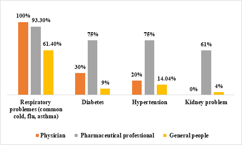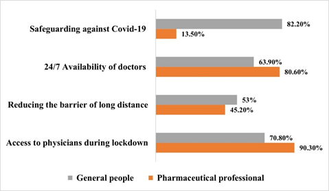Participants responses showed that respiratory problems (colds, flu, and asthma, for example) are the most prevalent health services provided in telemedicine according to 53.50% of general people, 93.30% of respondents from pharmaceutical professional and 100% of physicians. During a pandemic, another essential health service offered in telemedicine was Covid- 19, which was claimed by the common people (18.80%), persons from pharmaceutical professional (89%) and physicians (90%). Diabetes is another form of health treatment that is provided through telemedicine, according to general people (9%), persons from pharmaceutical professional (75%), and physicians (30%). Hypertension is also available via telemedicine, according to general people (8.20 %), pharmaceutical professional (75 %), and physicians (20%). Other health services, such as kidney problems, are also available in telemedicine, according to the general people (1 %) and people from pharmaceutical professional (61 %). All the responses are shown in Figure 2.