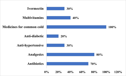 About prescribed medicine through telemedicine, 100% (n=10) cold medicine is prescribed by physician through telemedicine, 80% (n=8) analgesics and 70% (n=7) antibiotics are also prescribed by physicians. Physicians also prescribed 30% (n=3) ivermectin. Other drugs also mentioned multivitamin (40%, n=4), anti- hypertensive (30%, n=3) and ivermectin (30%, n=3). They are shown in Figure 3.