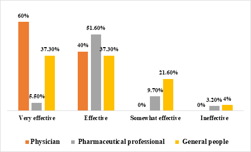 37.30 % of general people, 40 % of physicians, and 51.60 % of pharmaceutical professional said that it is effective during pandemic. Telemedicine is very effective, according to 37.30 % of the general people, 60 % of physicians, and 35.50 % of pharmaceutical professionals. Telemedicine is somewhat helpful during pandemics, according to 21.60 % of the general people and 9.70 % of the pharmaceutical people. However, 4% general people & 3.20% pharmaceutical professional said that telemedicine is ineffective. All these are shown in Figure 5. A Co-relational ANOVA test was done to understand the importance of telemedicine during the pandemic among different stakeholders. Since 0.248 > 0.05, we cannot reject the null hypothesis H0 and conclude that both stake holders gave same opinion that telemedicine is effective during the pandemic, which is shown in Table 4.