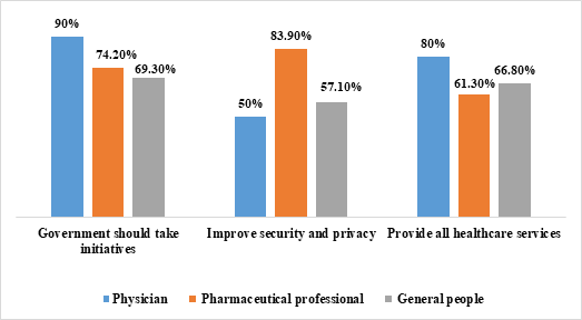 Finally, when stakeholders were asked about their opinions on the future prospect of telemedicine in Bangladesh, 80 % of physicians, 61.30% of pharmaceutical professional and 66.80 % of general people said that telemedicine should provide all health-care services. 50% of doctors, 83.90% of pharmaceutical people, and 57.10% of general people believed that telemedicine should improve security and privacy. 90% physicians, 74.20% of pharmaceutical professional and 69.30% of the common people said that the government should take the necessary steps to introduce telemedicine at all hospitals. Therefore, they concluded that telemedicine can be an effective tool of healthcare system for upcoming pandemics as well as emergency situations. The responses obtained are shown in Figure 7. A Co-relational ANOVA test was done to understand the proposed recommendation about telemedicine among stakeholders. Since 0.509 > 0.05, we cannot reject the null hypothesis Ho and conclude that both stake holders gave same opinion regarding recommendation about telemedicine in case of general people & pharmaceutical professional. Also, for pharmaceutical professional & physician, 0.381 > 0.05, so we cannot reject the null hypothesis Ho and conclude that both stake holders gave same opinion regarding recommendation about telemedicine. These are featured in Table 5.