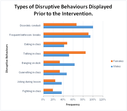 Question 1: What were the dominant disruptive behaviours prior to the intervention?: The results for this question were attained using an observational checklist and a teacher’s journal during the first three weeks of the intervention plan. Figure 1 shows the different types of behaviours exhibited by the grade two students prior to the intervention. The students were observed to determine the criteria for the checklist then further observed to gather information which was used to complete the observational checklist. The observational checklist revealed that 52% of the males were always talkative during the lesson, while 85% of the females displayed the same behaviour. Thirty-seven percent of males and 24% of the females were constantly making jokes during the lesson. There were frequent cases of quarrelling in the class among 47% of the males and 33% of the females were observed doing the same. Resulting from these quarrels at times were fights between males-males, males-females, and females-females. Thirty-seven percent of the males often fought and 19% of the females did the same. Disorderly conduct was the most disruptive of all followed by the request of bathroom breaks. One hundred percent of the males and 67% of the females for the most part of the lesson behaved inappropriately. Ninety-five percent of the males wanted to visit the bathroom to play, while the same was true for 91% of the females. Other playful but very disruptive activities the students took part in was banging on the desk during the lesson. This was evidence found amongst 63% of the males and 33% of the females. Forty-two percent of the males and 48% of the females were frequently caught eating in the class. The teacher’s journal that was used to document all that was observed in a class of 40 students; 19 males and 21 females contains the disruptive behaviours they exhibited. The disruptive behaviours observed and noted were banging on the desk, interrupting instruction, excessive chattering, and roaming the classroom. This was common to both males and females. The females however, were noted as more disruptive as they interrupted instructions to makes complaints very often.29