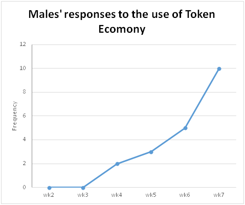 Question 2: How did the boys respond to the use to the token eEconomy?: The results for this question were assembled using a teacher’s questionnaire and a teacher’s journal from the fourth week of the intervention plan to the seventh week. Figure 2 demonstrates the observed changes in the behaviour of males toward the use of the token economy. During the second and third week of the intervention no change was observed in the behaviour of the males. However, through the use of tokens such as stickers, their academic performance improved. Changes became evident in the fourth week of the intervention. Two of the males were the first male students that responded positively to the tokens. These males were more cooperative and showed little signs of regrets for the disruptive behaviour they exhibited.30 Week 5 showed a slight decrease in the amount of males who were disruptive. An addition of one male student making it a total of three students showed positive response to the use of the tokens. These males were observed for weeks and were assumed to be close friends. All three males displayed similar results as observed in week 4 but they also showed that they were somewhat more attentive. During week 6, five more males were identified and noted as positive responders to tokens. They interrupted instructions less, cooperated in class activities without distracting other pupils and participated less in the banging of the desks. By week 7 achieving a token for the boys became a competition which resulted in an increase to ten males who became less disruptive. These males were more attentive, cooperative and distracted other pupils and instructions 0-3% less during class period. The teacher’s questionnaire revealed the effectiveness tokens have had on the students when used in previous situations. The response from the teacher’s questionnaire disclosed that the use of incentives tends to work with only a certain population of the class. In responding to the question, the teacher further explained that where mitigating disruptive behaviour is concerned, incentives normally work well with pupils who are intrinsically motivated as well as more advanced.31