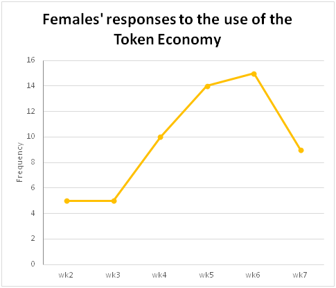 Question 3: How did the girls the use to respond the use of the token economy?: The results for this question were collected using the methods, teacher’s journal and teacher’s questionnaire during weeks 2, 4, 5, 6, and 7. The results presented in Figure 3 were displayed by the female population of the class. After the initiation of the intervention of tokens a decrease of 1% or 5 females was observed in the second week through to the third week. These 5 female students were less talkative and a bit more attentive. As the week progressed, by week 4 there was an immense increase in the number of female students who responded positively to the tokens. Ten of females showed a reduction in the level of chattering, interrupted the class less to request permission for bathroom breaks and cooperated more willingly in group activities. By week 5, 66 % or 14 females’ involvement in quarrels and other disorderly conducts decreased significantly as a result of changing in seating arrangements. In the course of week 6 a slight increase was observed in the improvement of the females’ behaviour. Their attitudes had changed. This was seen in 71% or 15 of the female students. However, in week 7 the females became unresponsive to the tokens. Fifteen females were observed as less disruptive; they responded positively to the strategy Token economy in week 6 but a setback was noted in the seventh week where only 43% or 9 females were now responding positively to the use of the token economy. Six of the formerly less disruptive female students now demonstrated behaviours which were interruptive. They re-engaged in quarrels, excessive chattering and started to interrupt instructions to make complaints once more.