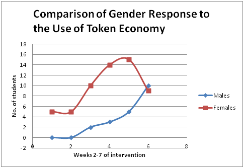 One of the questions listed on the teacher’s questionnaire read, what is the outcome of using incentives and how does it impact students who exhibit disruptive behaviour. The reply was that the population of the class which exhibited disruptive behaviours continued to do so even if the strategy token economy is used. The response that was given is similar to what was observed in week 7 of the intervention. At the initial stage of the intervention plan the females responded quickly and positively to the use of the tokens. The decrease in their disruptive behaviour was consistent from the second week through to the sixth week. However, upon approaching the seventh week, the females showed signs that they reverting to being disruptive. This was evident as the numbers decreased from 15 to 9. At week six, 15 females were responding positively to the token economy. This fluctuated to 9 females by week seven. The males on the other hand responded slowly to the use of the token economy. However, as time progressed they started to change their behaviour which was favourable to the researchers’s intension of the survey; to decrease disruptive behaviour using token economy. The behaviours were observed to be decreasing in the males from week four consistently through out to week seven which continued until the intervention was phased out. From this observation it can be concluded that the males responded more positively to the use of tokens to decrease disruptive behaviour in the class. The information gathered from the teacher’s questionnaire suggested reasons for the fluctuation in the females’ progress and the slowed reaction of the males toward the token economy system. It was opined that this could probably be the result of the class size; student teacher ratio, student being academically challenged, lack of parental involvement, nutrition, and exposure to inappropriate social upbringing. (Figure 4)