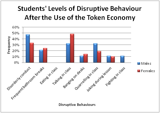 Question 4: What were the dominant disruptive behaviours after the intervention?: The results for this question were collected using an observational checklist and a teacher’s journal. Figure 5 reveals the students’ behaviour after the intervention plan was implemented for a period of seven weeks. After the completion of the second checklist various changes were observed in the students’ behaviour. After the use of the tokens only 32% of the males and 48% of the females continued to talk during the lesson. The levels of joking during the lesson decreased. This was now done by 11% of the males and 10% of the females. Quarrelling in the class among the males decreased to 32% and the same was observed for 19% of the females. As a result of the reduction in the occurrence of arguments came a reduction in the number of fights. Zero percent of the females fought and only 11% of the males still fought in the class. Fewer students participated in the activity of banging on the desks. This number of students who participated in such activity decreased to 11% of the males and 14% of the females. Another impressive change was observed in the students’ conduct, where only 47% of the males and 33% of the females still proceeded to behave in a disorderly manner. The token Economy was observed to have the most impact on the disruptive behaviour of eating in the class, because after the intervention 0% of the males and 0% of the females participated in such activity. The frequent request to go to the bathroom decreased to 21% of the males and 24% of the females.