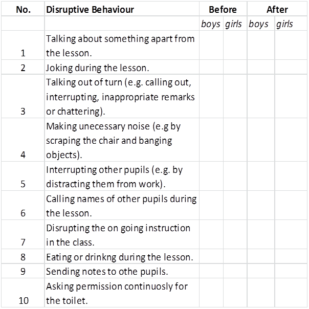 This survey was achieved through an eight-week intervention plan among a class of 40 students at a primary school in Manchester. These students exhibited disruptive behaviour in the class which created barriers to other students’ achievement. Because of these barriers most of the time reserved for the teaching and learning process was taken up with non-instructional activities such as tokens, in an attempt to decrease disruptive behaviour. From the activities, data was collected and used to answer four sub-research questions. The methods used to collect the data were teacher journal, observational checklist, and teacher’s questionnaire (Table 1).