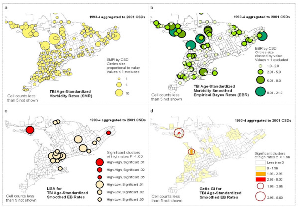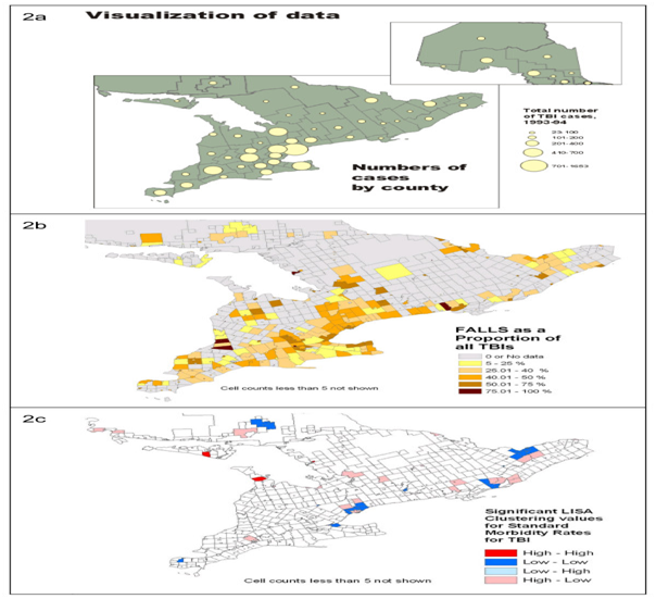 In another study, Using Geographical Information Systems Mapping to Identify Areas Presenting High Risk for Traumatic Brain Injury, Colantonio et al.,10 show how “geographical information systems (GIS) can be used to track and compare hospitalization rates for traumatic brain injury (TBI) over time and across a large geographical area using population based data”. To do so, they used the Ontario Trauma Registry Minimum Data Set and Statistics Canada Census Geographic files in mapping and analyzing data on TBI hospitalizations as shown in Figure 2, and geographic and demographic variables using “various visualization techniques, exploratory data analysis and spatial analysis”. In addition, they studied “both the raw and standardized rates by age/gender of the geographical unit”.