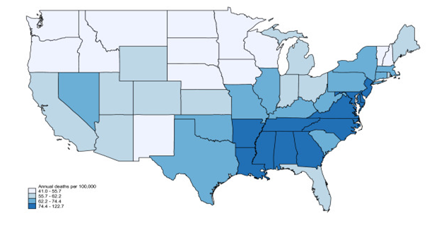 Furthermore, in the study National Variation in United States Sepsis Mortality: A Descriptive Study, Wang et al.,11 analyze national vital statistics data for a period of 1999 to 2005 retrieved from the National Center for Health Statistics’ Compressed Mortality File (CMF), “which contains data on the age, race, sex, year and causes of all US deaths in calculating national and state age-adjusted sepsis-attributed deaths according to the ICD-10. Figure 3 shows the regional variation in sepsis mortality in the United States from 1999 to 2005”. To do so, they “used an analytical approach similar to prior studies of stroke death clusters. We used age-adjusted mortality rates provided by CMF, which adjusts relative to intercensal (1999), actual (2000) or postcensal (2001 to 2005) US Census population estimates”.11