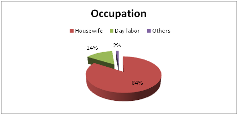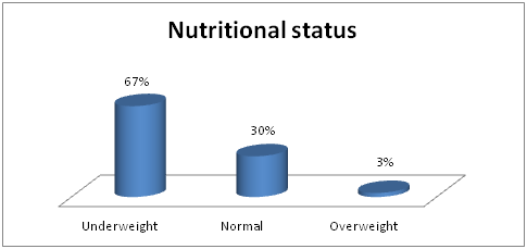 Table 1 shows that 42% of the respondents was in age group 35-44 years and 29.5%, 16% and 12.5% was in 25-34, 15-24 years and ≥45years with mean age 34.27±8.60 years. More than half (67%) of the respondents were illiterate followed by primary (21%), SSC (8%) and HSC (4%) (Table 2) (Figure 1). Most of the respondents were housewife (84%) followed by day labor (14%) and others (2%). Table 3 shows almost 95% respondents monthly family income was <5000 BDT followed by 5000-15000 BDT (4%) and ≥15000 (1.5%). Mean±SD income of respondents was 5700.71±282.89 per month (Figure 2). Underweight, normal and overweight were 67%, 30% and 3% respectively (Table 4). Age group (p<0.05), education (p<0.05), occupation (p<0.05) and monthly income (p≤0.05) significantly affects nutritional status.