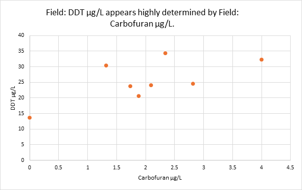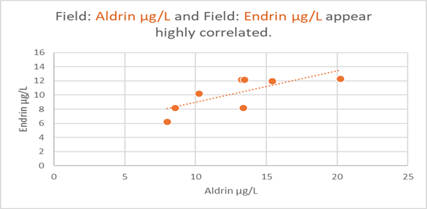 Aldrin ranged between 8ug/l and 20.22ug/l, Atrazine (0.88-2); Carbofuran (0.00-4.00); Chlordane (0.00-2.3); DDT (13.52-34.33); Endrin (6.22-12.33); Lindane (0.00-3.0); Paraquat (0.00-3.4). The table above shows that the tributary systems of Ikwo (site ii) and Okue (Site ii) that drain the central parts of the study area is the most polluted with pesticides. Further excel spreadsheet analysis revealed (Table 1a & 1b) that the concentration of Aldrin is highly correlated with Endrin while DDT occurrence seem highly determined by Carbofuran concentrations or use.
