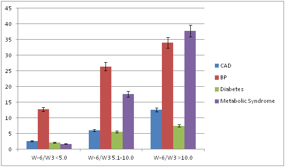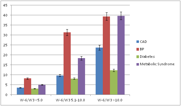 Conclusion: MS has become a public health problem in India. Higher w-6/w-3 ratio is a major risk factor of MS and CAD. It is possible that a low w-6/w-3 ratio in the diet (<5.0) may be protective against MS and related components.