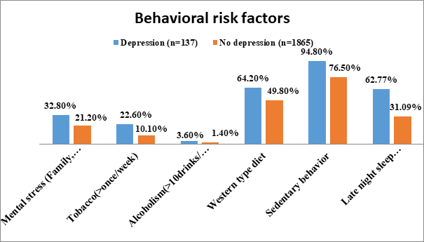 The prevalence of mental stress, tobacco intake, alcoholism, western type diet and sedentary behavior were significantly more common, more so among patients with depression (Tables 2–4), (Figure 1).