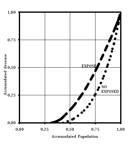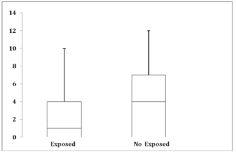The value of the dmft index was 2.74 (SD=3.50) for those exposed to fluoridated water and 4.17 (SD=3.50) for those not exposed (Table 1). Mode was 0.0 in both distribution and the median was 1.0 for those exposed and 4.0 for those not exposed. The amplitude of variation was 13 for those exposed and 12 for those not exposed. The coeficiente of variation was 1.28 for those exposed and 0.84 for those not exposed (Figure 1). The box plot shows the patterns of variability of the two populations. It shows that diferente magnitudes represented by the values of dmft index were not from aberrante values, the non-occurrence of outliers (Figure 1). The percentage of individuals without caries experience was 43% in those exposed and 31% in those not exposed. Already, the percentage of children with three or more caries was 36.2% in those exposed and 59.4% in those not exposed (Figure 2). Both those exposed and not exposed presented distributions marked by moderate internal inequality (Figure 3). The Lorenz curves for those exposed and not exposed corresponded to Gini Coefficients of 0.6574 and 0.4835, respectively. We observed a curve for those exposed, greater inequality in the distribution of the disease, indicating more polarization, compared to the curve corresponding to those not exposed. This characteristic of the distributions of dmft values in the exposed and no exposed populations is also expressed in the mean values of the dmft index. The PR between those not exposed and those exposed (PR=NE/E) was 1.21, indicating little expressiveness in prevalence difference. The chi-square value (2.777; p=0.96, α = 5%) indicated that the prevalence difference cannot be attributed to the exposure to the preventive measure.