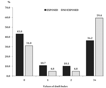Data processing was performed using the Epi-Info software. The experience and magnitude of dental caries in children exposed and not exposed to water fluoridation was evaluated using the dmft index. We measured the scaling of the difference in the prevalence between exposed and not exposed using the prevalence ratio (PR) and we tested the exposure-disease association Pearson's chi-square statistics.