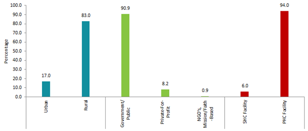 Figure 1 Percentage Distribution of Health Facilities Assessed by 'Locality,' 'Facility Ownership Type,' and 'Facility Level of Care'.