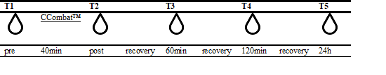 All participants rested for 72 hours before the exercise protocol. In an observational and cross-sectional cohort study, the athletes engaged in high-intensity functional exercise (40 min). According to the method's creator, the CCombat protocol was created for the highest level of performance. The protocol involved 12 different exercises combined in six modules combined according to their equivalence. The subjects were only instructed to drink water after the collections scheduled for each day.
