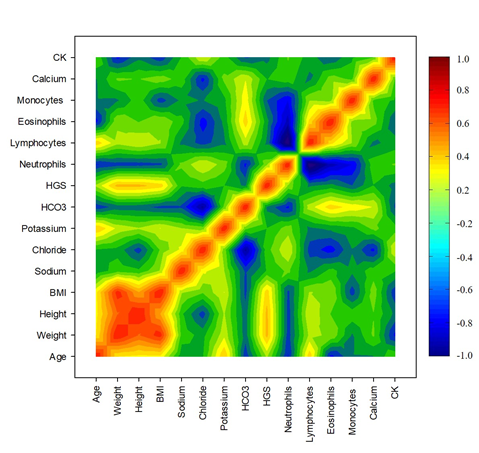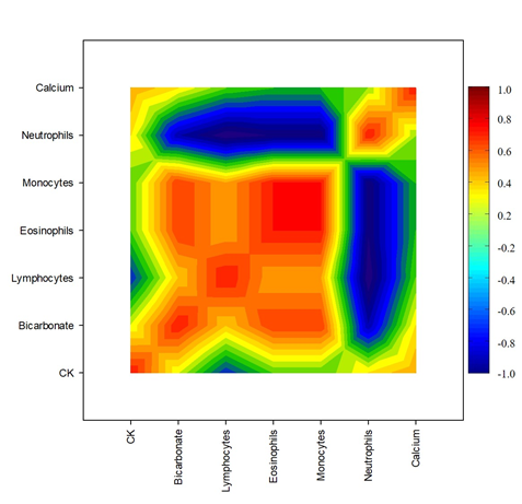 Figure 2 The heat map containing Spearman's correlation coefficient indicates a negative correlation between Neutrophils and lymphocytes (-0.935 – P value 0. 0000002) and bicarbonate and chloride (-0.647 e P value 0.0000002).