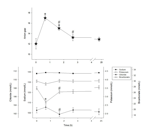 Figure 3 The negative correlation observed between bicarbonate and chloride affects the anionic gap in the immediate post-exercise time (AG = [(Sodium + Potassium) – (chloride + Bicarbonate)].