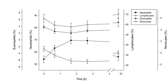 Blood samples were collected at the following times: pre-exercise collection (Pre); immediately after exercise (Post); 60 minutes after the end of exercise (+60 min), 120 minutes after the end of exercise (+120 min); 24 hours after the end of exercise (+24 h). Blood samples were collected from the medial cephalic vein by an experienced venipuncture. Samples were collected either in the presence or absence of EDTA (Vacutainer®, BD, NJ, USA) for hematological or serum analyses, respectively.