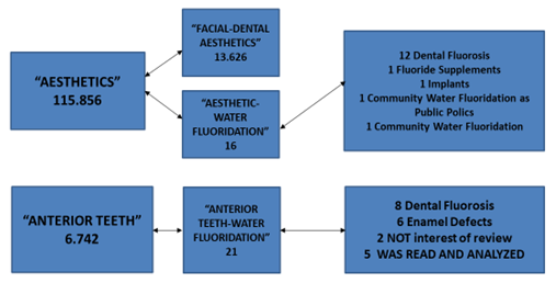 With the first search strategy, 115.856 articles on aesthetics were split, reduced to 13.626 by the “dental aesthetic” or “facial aesthetic” filters. This product was submitted to the “water fluoridation” filter and no articles remained. The filter “water fluoridation” for the term “aesthetic” resulted in 16 articles, of which 12 referred to dental fluorosis, 1 about “fluoride supplements”, 1 about “implants”, 1 about “community water fluoridation as a public policy” and 1 had a systematic review on “community water fluoridation”.