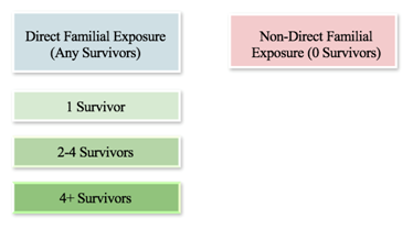 278 ancestrally Armenian participants, with ages between 10 and 80 (28% 10-20y/o, 43.6% 21-30y/o, 8.4% 31-40y/o, 8% 41-50y/o, 7.3% 51-60y/o, 4% 61-70y/o, 0.7% 71-80y/o) were selected at random via social media and community recruiting. Subjects were then given this questionnaire via the online platform, Google Forms in both English and Armenian translations. The data collected was then split into two groups of study, one being the “direct familial exposure” group, looking at participants who had a lineage of forbearers directly surviving the Armenian Genocide, and the other group being the “non-direct familial exposure” to genocide group, looking at participants whose lineage had no survivors in the Armenian Genocide. The data for the “direct familial exposure group” was then split into 3 groups (“1 survivor”, “2-4 survivors”, and “4+ survivors”) depending on how many survivors there were in a person’s lineage (Figure 1).
