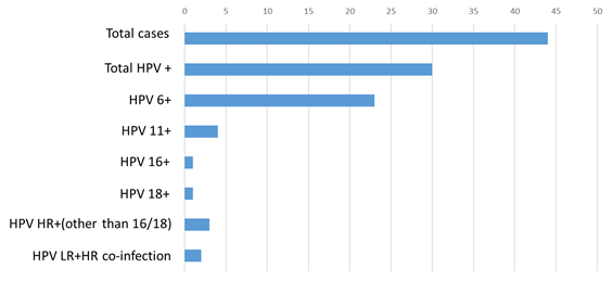 Out of 44 wart specimens from 44 patients, 30 (68.18%) were positive for HPVs (Figure 1). Among the 30 HPV positive cases, 22 were female and 8 were male patients. Of these 30 HPV positive warts, 27 were of HPV low risks type, and 5 were of HPV high risks type that included 2 co-infections for the both types. Out of these 27 low risk HPVs, 23 were HPV type 6, and 4 were HPV type 11 (Figure 1).