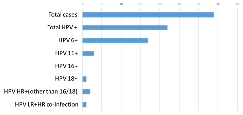 Wart was primarily diagnosed on visual examination by the attending dermatologist or gynecologist at their respective clinic. A small clip of tissue and/or swab is taken by the physician at their clinic and sent to molecular lab for HPV confirmation by PCR. We extracted DNA from wart specimens from 34 females who attended our dermatology and gynecology clinic. Out of the 34 females, we found 22 patients (64.7%) were HPV positive (Figure 2). Among these 22 positive cases, 19 (86.36%) were low risk HPVs and 2 (9.09%) are high risk HPVs and one co-infection with high risk and low risk HPV (Figure 2). Among the 20 (including one co-infection) low risk positive cases, 17 (85%) were HPV 6 and 3 (15%) were HPV 11. Among the two high risks positive cases one was HPV 18 and one was HPV other than 16/18. Interestingly, one specimen was found positive both for low risk (HPV 6) and high risk (HPV other than 16/18).