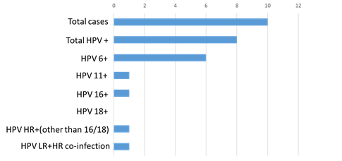 We extracted DNA from wart specimens from 10 male patients who attended our dermatology clinic. Out of 10, we found 8 patients (80%) were HPV positive (Figure 3). Among these 8 positive cases, 7 (87.5%) were low risk HPVs and one (10%) was high risk HPV and one co-infection with high risk (HPV 16) and low risk (HPV 6). Among the 7 low risk positive cases, 6 (85.7%) were HPV 6 and 1 was HPV 11 (Figure 3). Among the two high risks positive cases, one is HPV 16 and one is HPV high risks other than 16/18. Similar to female group, one case is found both positive for low risk (HPV 6) and high risk (HPV other than 16/18).