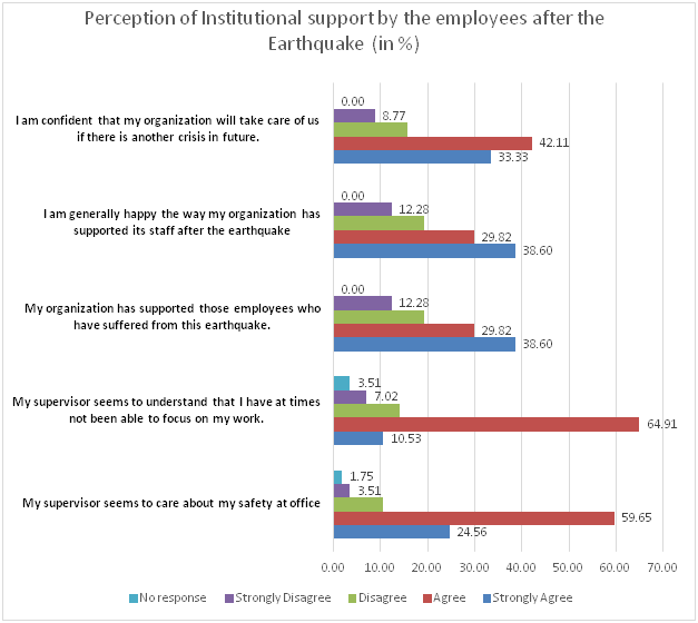 The respondents’ rating towards their institution and HR manager was very impressive. 69% respondents have shown overall satisfaction and were categories their perceived level of support under ‘strongly agree’ and ‘agree’ categories in all five domains. Nearly 70% respondent was found happy and satisfied with the support available to them through their HR managers and respective institutions after the mega earthquake. 76% respondent reported that their HR managers were very concerned with the stresses their subordinate faced and did not push a lot of institutional priorities. 85% of respondent perceived their HR managers as caring and supportive. The majority of those who disagree (average of 21% respondents) came from the corporate house and insurance sectors; and who were mid-managers and in lower positions (equally male and female). Nevertheless, 75% respondent believed that their institution would support them in the future crisis like the mega earthquake in April 2015 (Chart 1).