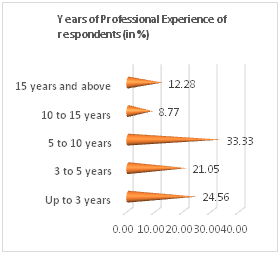 The overall workforce who participated in this survey were highly educated individuals. The level of position in their respective institutions was also represented highly in the survey. 68.5% respondents were either middle managers (44%) or senior managers (24%); followed by supervisory and support level. Average salary and enumeration were also analyzed, the average salary range of male participants was found higher compared with the female; which might be caused by the lesser inclusion of female in most top executives. More than fifty percent (54%) of the respondent reported five years or above experiences in their respective field. The majority of the respondent, above 63%, comes from more than 40,000 per month income group. The analysis has shown that the qualification and years of experience were highly correlated with their income and designation in their respective field; that not only promotes their psychological wellbeing but also prevents from being boredom at work and reduces burnout (Chart 4), (Chart 5).