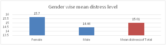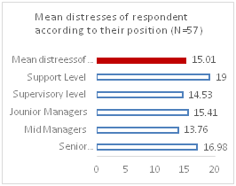 The distresses of respondent were analyzed after considering different elements of the respondents. At the individual level, the anxiety level of 19.3% respondent was found higher than the threshold, whereas, overall distress, level of depression and level of psychosomatic pain was above the threshold for 3.5 % of respondent. 1.75% participants need further assessment of potential suicidal risk (Chart 6). Gender-segregated data outcomes have shown significant differences between the mean distress of men and women. Overall distress of male (Mean=14.46) was found lower than the mean value of overall distress (Standard Mean =15.01) of the participants; whereas female participants (Mean=15.70) were more distressed than male (Chart 7). Distresses of Support level (Mean: 19.0), and senior managers (Mean: 16.98) was found higher than others (Standard Mean: 15.01); middle managers were corporately more resilient (Mean: 13.76) (Chart 8), (Chart 9).