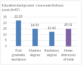 Mean distress of respondent with above post-graduation degree shown extremely high (Mean=22.48), where, distresses of post graduated (Mean: 14.93) respondent was even slightly below the standard mean. Distress of respondent with Bachelor’s degree has relatively too low (Mean=12.42) than the Standard Mean.