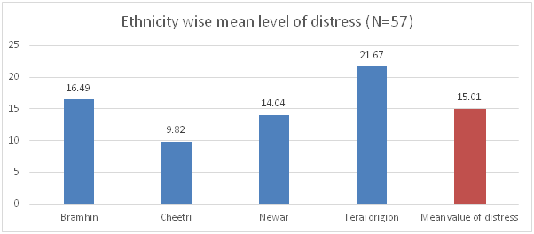 Respondents from Terai origin (Mean: 21.67) were found heavily distressed, followed by Bramhin (Mean: 16.49); whereas distressed of Cheetri (Mean: 9.82) respondent was sharply low than the standard mean (Mean: 15.01) (Chart 10).