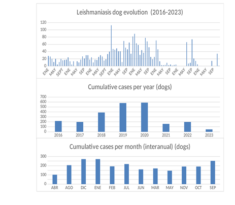 Figure 2 Canine leishmaniasis evolution (2016-2023), cumulative cases per year and monthly (interannual).