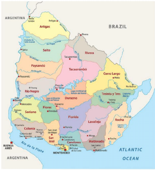 Figure 1 Uruguay map showing the political-administrative division (19 departments)—source: Maps land (published under the Creative Commons Attribution-Share Alike 3.0 Licence).1